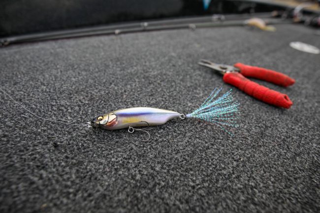 The Megabass GRAND SIGLETT is equipped with a double hook. It will allow you to reach the farthest recesses of enticing overhangs. In dense cover, set the hook upward, to keep hook points alongside the body and out of the way. When targeting open water or short-bite situations, set the hook points so they face away from the body.
